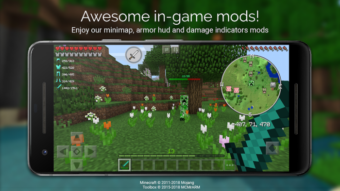 Изменения интерфейса. По желанию игрока Toolbox для Майнкрафт: PE добавляет на экран Дроид мини-карту, статусы брони и орудия, характеристики урона и иные индикаторы.